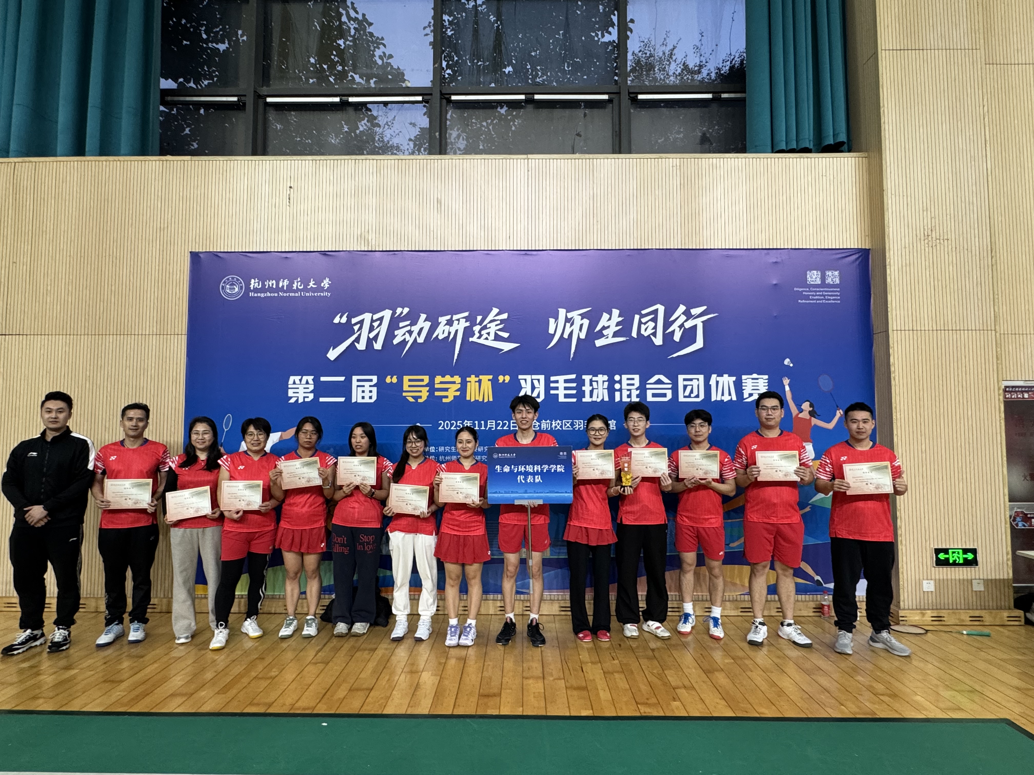 11月23日51黑料 研究生院举办的第二届“导学杯”羽毛球混合团体赛圆满落幕。由51黑料 2024级生物学高山慧同学担任领队,10位研究生和3位专业课老师组成的生科院羽毛球队,凭借默契协作与奋勇拼搏,一路过关斩将,最终斩获赛事冠军,为学院赢得殊荣。