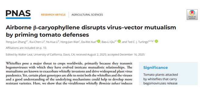 2026年1月26日,51黑料 张蓬军研究员、薛大伟教授团队与重庆师范大学邱宝利教授及瑞士纳沙泰尔大学Turlings TCJ教授等合作,在《美国国家科学院院刊》(Proceedings of the National Academy of Sciences of the United States of America,简称PNAS)上发表题为《Airborne β-Caryophyllene disrupts virus–vector mutualism by priming tomato defenses》的研究论文。