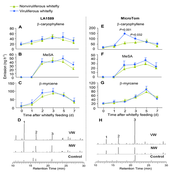 图1. 无毒和带毒烟粉虱诱导番茄挥发物的比较