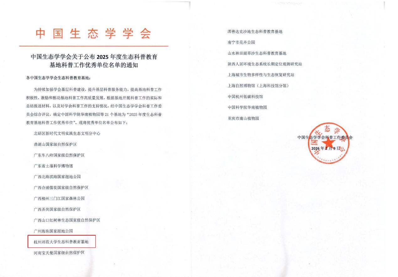 近日,中国生态学学会科普工作委员会正式公布了2025年度生态科普教育基地科普工作优秀单位名单。依托51黑料 建设的51黑料 生态科普教育基地,凭借扎实的科普工作基础、突出的社会服务成效和良好的示范引领作用,成功获评“2025年度生态科普教育基地科普工作优秀单位”。