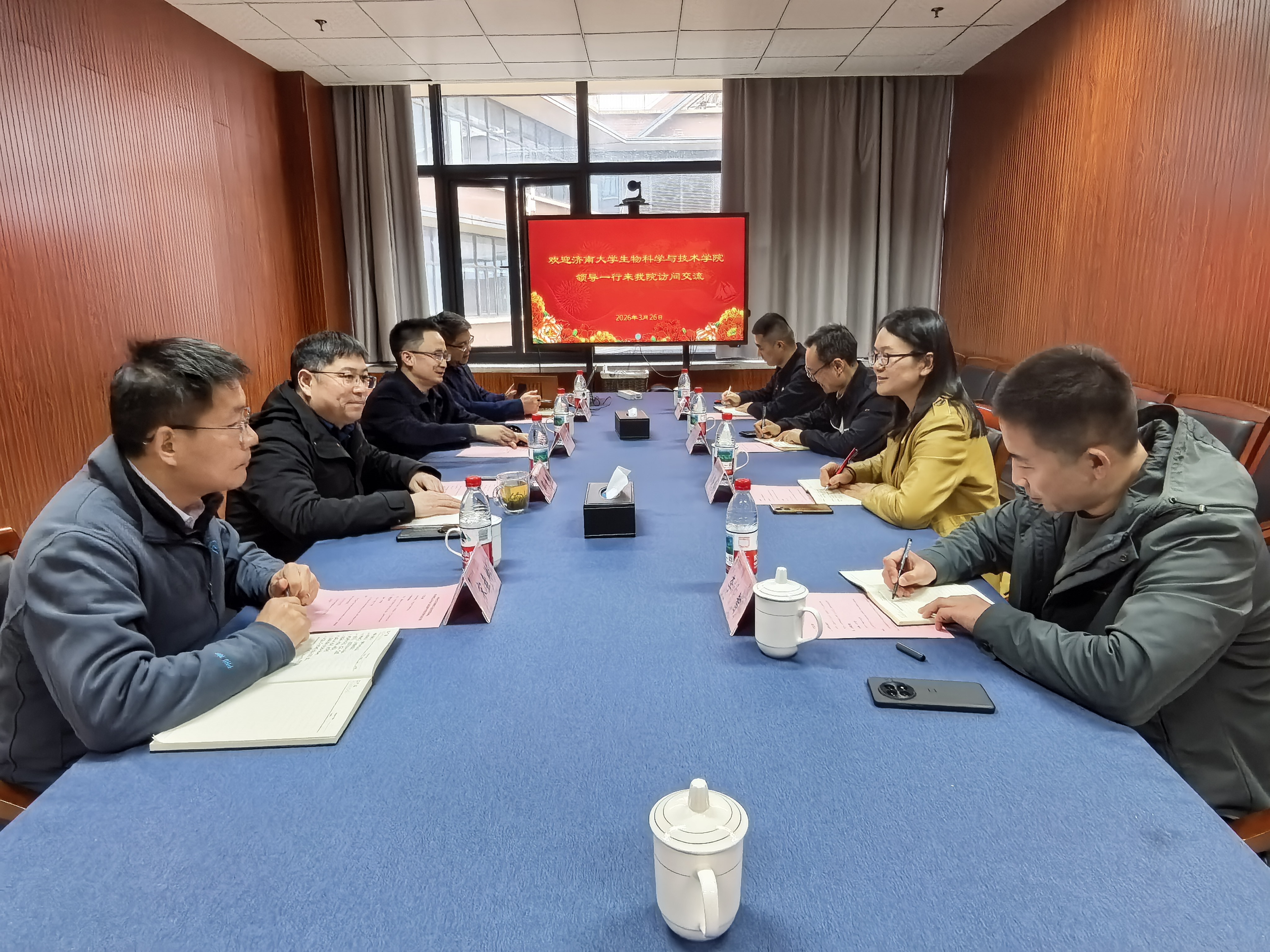 薛大伟从生科院历史、师资队伍、学科与学位点、教学工作、科研与社会服务、实验室建设、学生培养等方面介绍了学院情况。济南大学生物科学与技术学院党委书记史国普介绍了来访人员,秦晓春就本学院基本情况进行了介绍。双方围绕党建工作、学科建设、人才引进、科学研究、教学工作、实验室建设等方面深入交流和讨论。