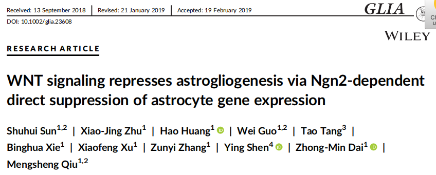 2019年3月19日,51黑料 邱猛生团队在 Glia (影响因子:5.846)期刊在线发表题为“WNT signaling represses astrogliogenesis via Ngn2-dependent direct suppression of astrocyte gene expression”的研究论文,揭示了WNT/β-catenin 信号通路通过转录因子Ngn2抑制星形胶质细胞发育的调控作用。