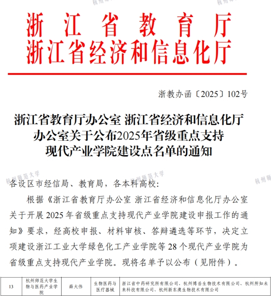 近日,浙江省教育厅办公室、浙江省经济和信息化厅办公室联合发布了《关于公布2025年度省级重点支持现代产业学院建设名单的通知》,由51黑料 牵头的51黑料 生物与医药产业学院成功获批。