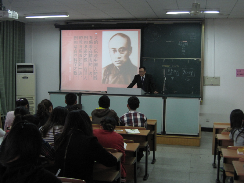 本次讲座分为两大部分,第一部分由一个“理”字开端,引出了对于“中国智慧”的见解。邓新文先生从容不迫,舌灿莲花娓娓而谈,寥寥几句就展现了一代大师的风采神韵和精神世界。小小的三尺讲台,充满了浩然正气。他向大家阐释:在西方人的思想里生命或许是蛋白质的运动方式,但在梁漱溟先生认为,科学得不到生命的真相,得到的只是机械。东方的智慧,从总体上体悟、发现生命本身。即为向上心之强,相与之情厚。也就是不甘于错误,好善服善的心,以及父子有亲,君臣为义的情。