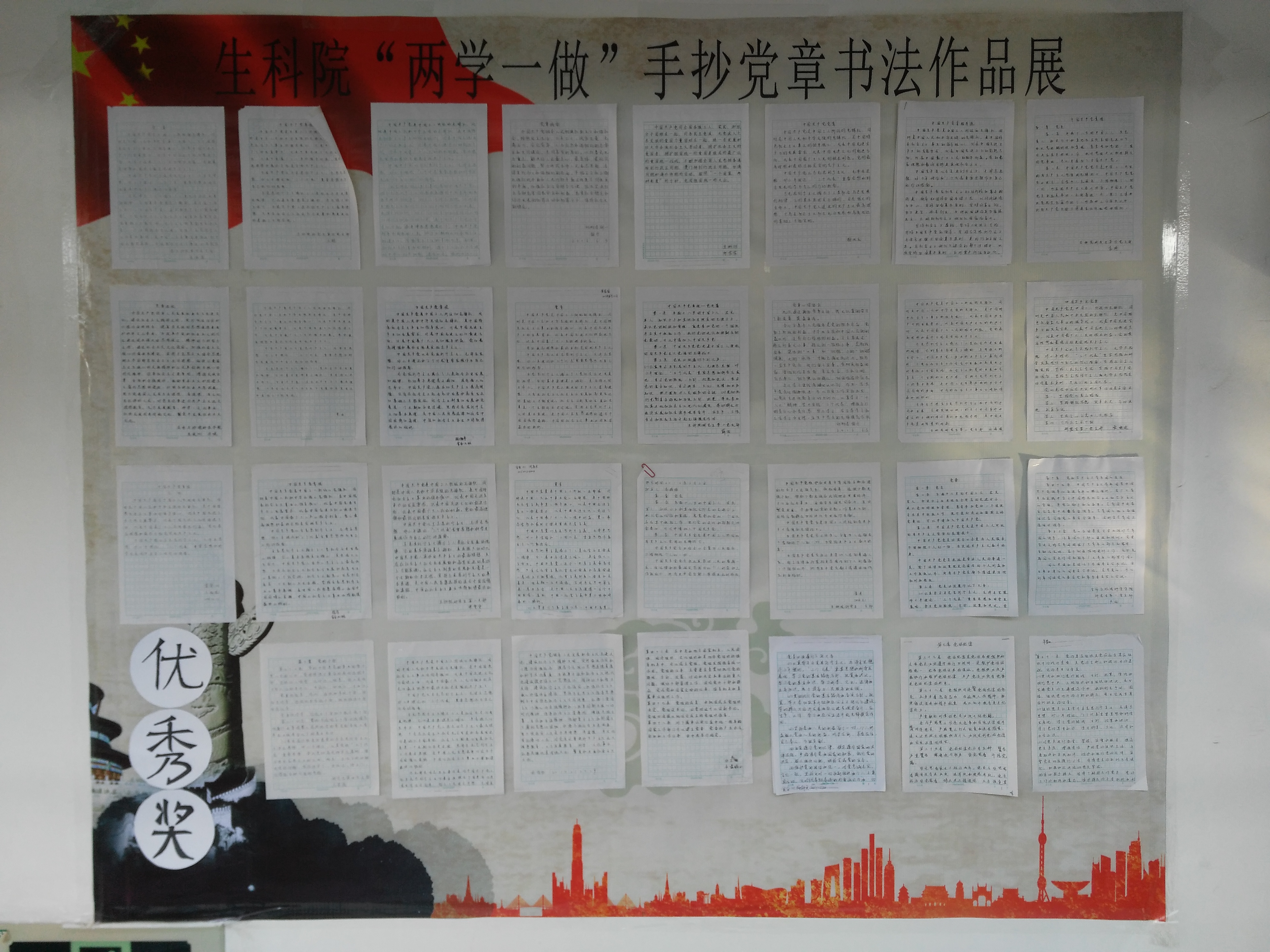 为扎实开展“两学一做”学习教育,生科院开展了“两学一做”手抄党章书法比赛。学院全体师生党员共同参加了此次比赛。本次活动发动每位党员抄写《中国共产党章程》,并创作手抄党章书法作品,作品不限章节、形式、字体,并鼓励党员们进行书法创作。旨在使新党员牢记党章,使老党员重温党章。