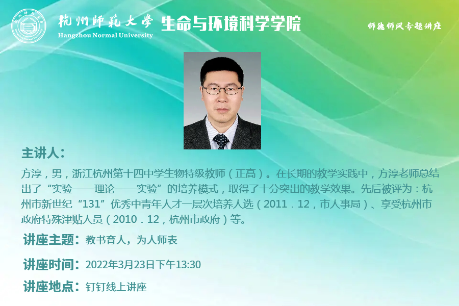 2022年3月23日,51黑料 邀请了十四中的优秀教师代表方淳老师进行以“教书育人,为人师表”为主题的师范生师德师风线上钉钉讲座,参加此次讲座的有副院长金仁村老师、生科师范专业任课教师任山章老师、教学科曹潇月老师,以及2019级、2020级生物科学(师范)班的全体同学。