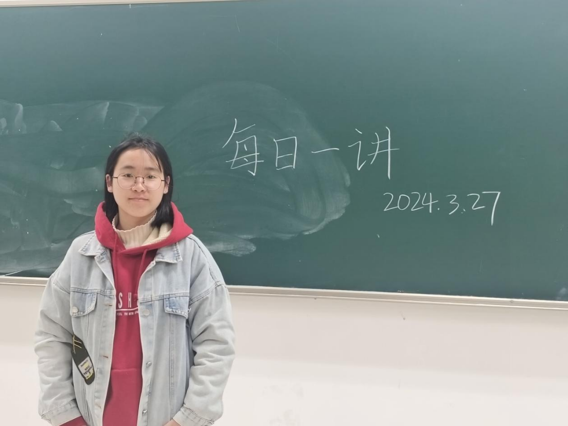 2024年3月27日早上上课之前,在慎园1号楼306教室刘文婷给我们带来了以《不负春光,起而行之》为主题的演讲。