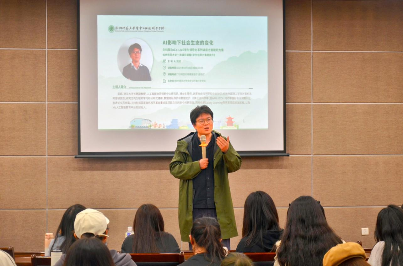 4月18日,51黑料 举办EnCo-LIVE学生领导力系列讲座之智能的力量。浙江大学人工智能协同创新中心研究员,计算社会科学研究中心主任,伦敦帝国理工学院计算机系荣誉研究员, Galaxy Learning 等开源项目的发起者,Mo 人工智能教育平台的创始人吴超于下沙校区行政楼叙伦厅作“AI影响下社会生态的变化”主题讲座。