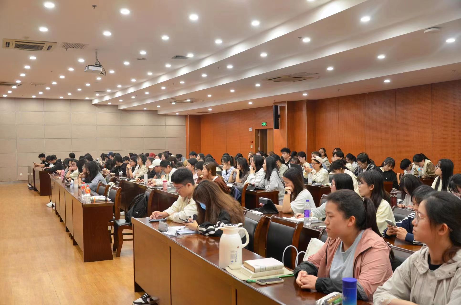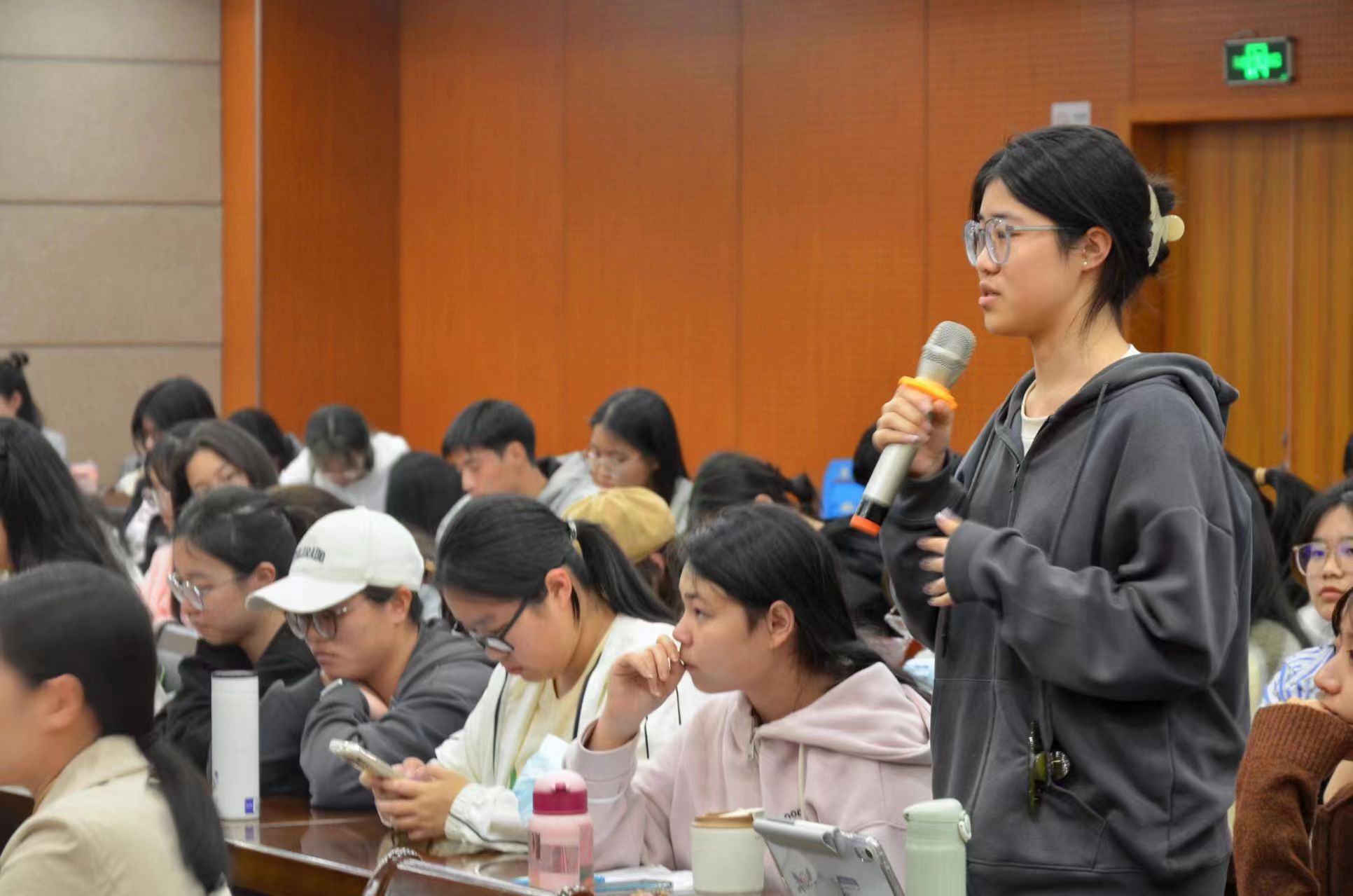 在提问环节,同学们踊跃提问,现场反响热烈。吴超为同学们分析了人工智能大环境下师范、护理等行业的走势,解答了艺术创作在人工智能加持下的发展问题,勉励在场同学们放稳心态,未雨绸缪,面对人工智能的发展秉持更理性的态度。
