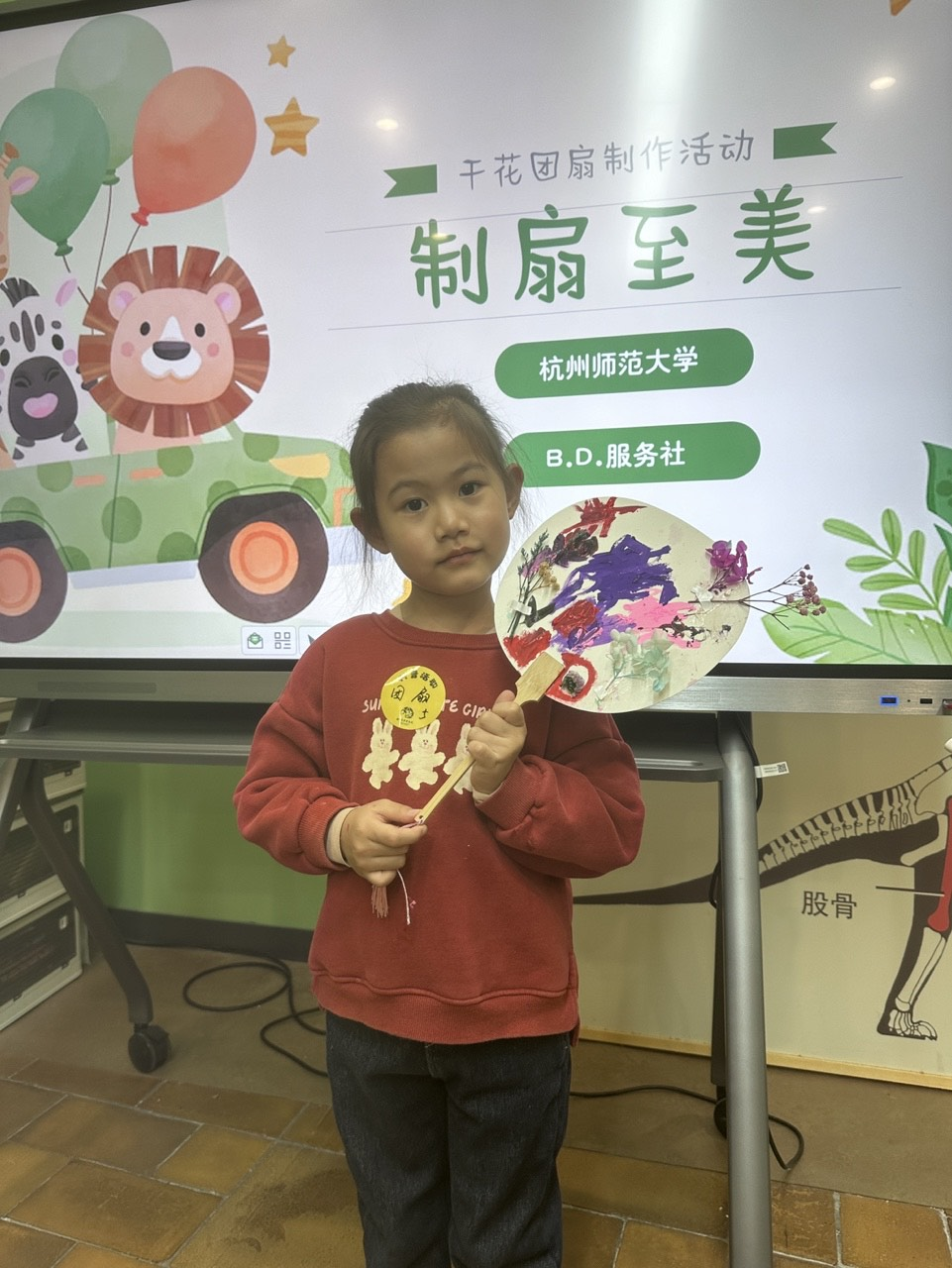 活动当天下午,志愿者们身着红马甲准时抵达博物馆并迅速完成场地布置,随后开始招募小朋友参与活动。活动正式开始后,主持人以幽默风趣的语言和丰富的知识储备进行课程讲解,成功吸引了小朋友们的注意力,提问互动环节中小朋友们踊跃举手发言。接着主讲人详细介绍了干花团扇制作方法,志愿者们则在一旁协助小朋友们发挥想象力进行创作,现场氛围温馨和谐,活动结束后小朋友们兴奋地展示了自己的作品,志愿者们用相机记录下这些美好瞬间。