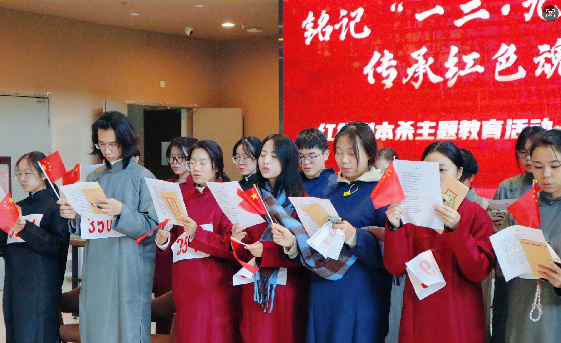 活动当天,参与者们身着民国服装,回到了那个烽火连天的年代。活动以红色剧本杀的形式展开,将历史背景与故事情节巧妙结合,让参与者在角色扮演中深刻体会“一二九”运动的历史意义和精神内涵。剧本中,学生们分别扮演了不同身份和立场的角色,包括学生领袖、爱国青年、普通市民等。在紧张刺激的剧情推进中,他们不仅需要解开一个个谜团,还要面对各种抉择和考验。