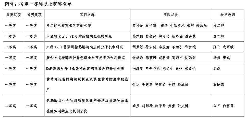 我校师生历经10个月的全力奋战,从组建82支队伍、353名本科生的庞大参赛阵容,到初赛阶段的激烈角逐,最终11支队伍凭借优异成绩晋级决赛。在决赛中,参赛作品“多功能丛枝菌根真菌的构建”、“大豆转录因子PTF6的耐盐响应机制研究”、“水稻WRD1基因调控热胁迫响应的分子机制研究”、“膳食补充梓醇调控异色瓢虫生殖发育的作用研究”、“KAP基因对褐飞虱繁殖的影响及其调控分子机制”和“黄精内生菌防腐机制探究及其在黄精防腐中的应用”分别获得了国赛和省赛一等奖。“氨基酸类化合物对脂质氧化产物活泼羰基物质毒性的抑制效应及机制研究”获得了省赛一等奖。